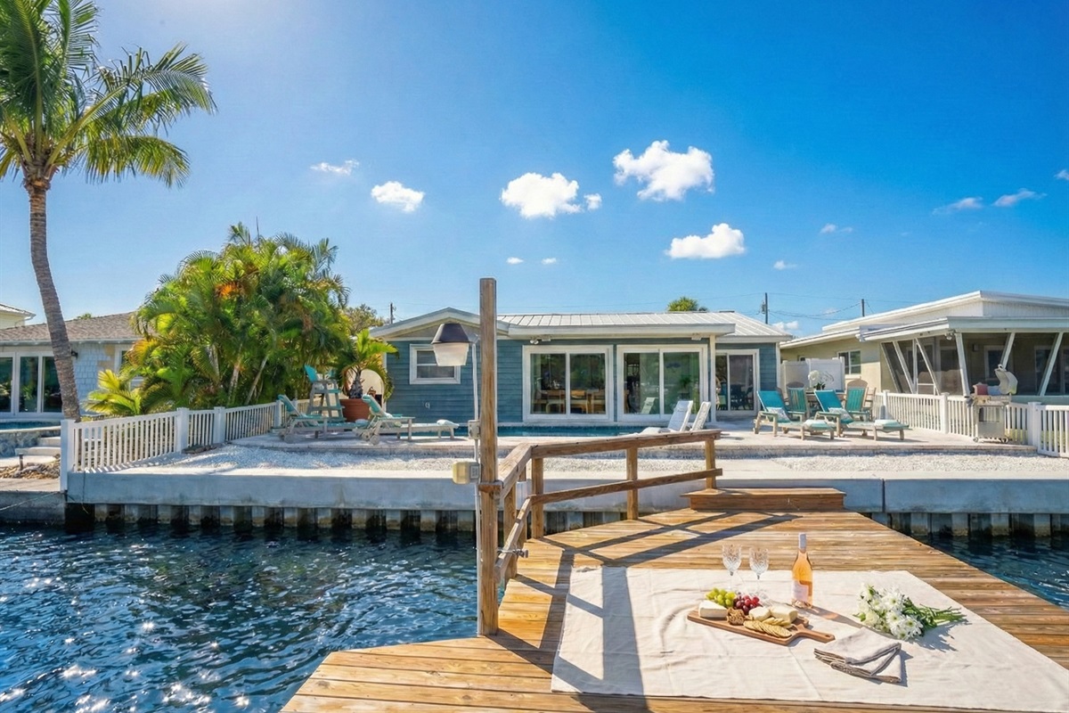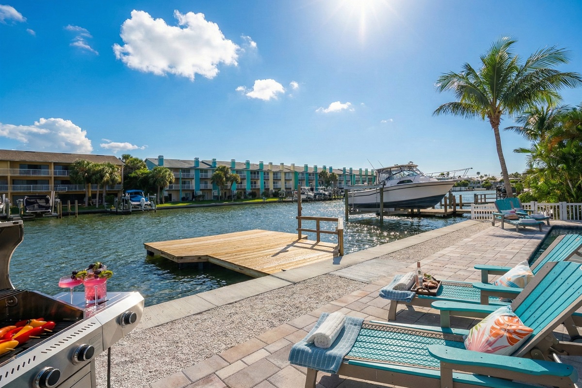 - Private dock and patio with BBQ grill, lounge seating, and dolphin sightings