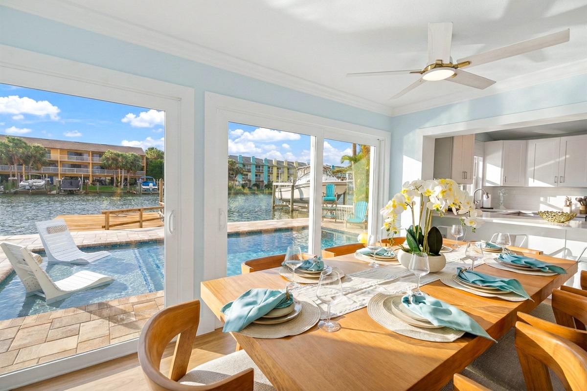 - Indoor dining table with waterway views + outdoor 8-person dining area