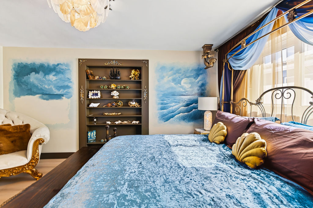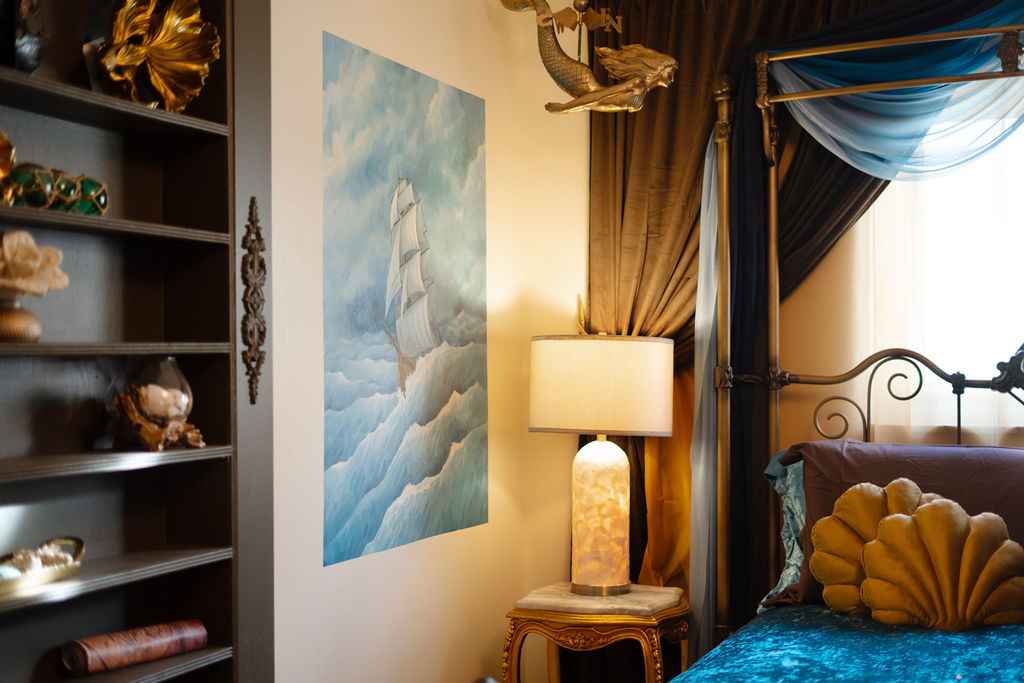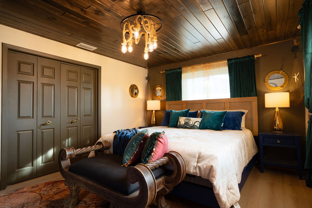 NOT YET COMPLETE: Mermaid Room â King bed retreat with smart TV and shared JackâandâJill bath. Lured by the sirenâs song, this oceanâinspired hideaway blends whimsy and comfort for a magical nightâs rest