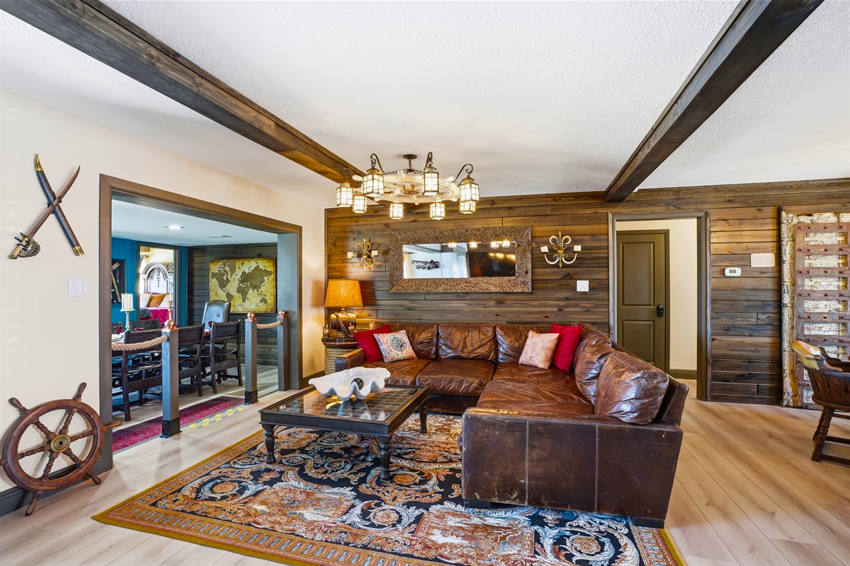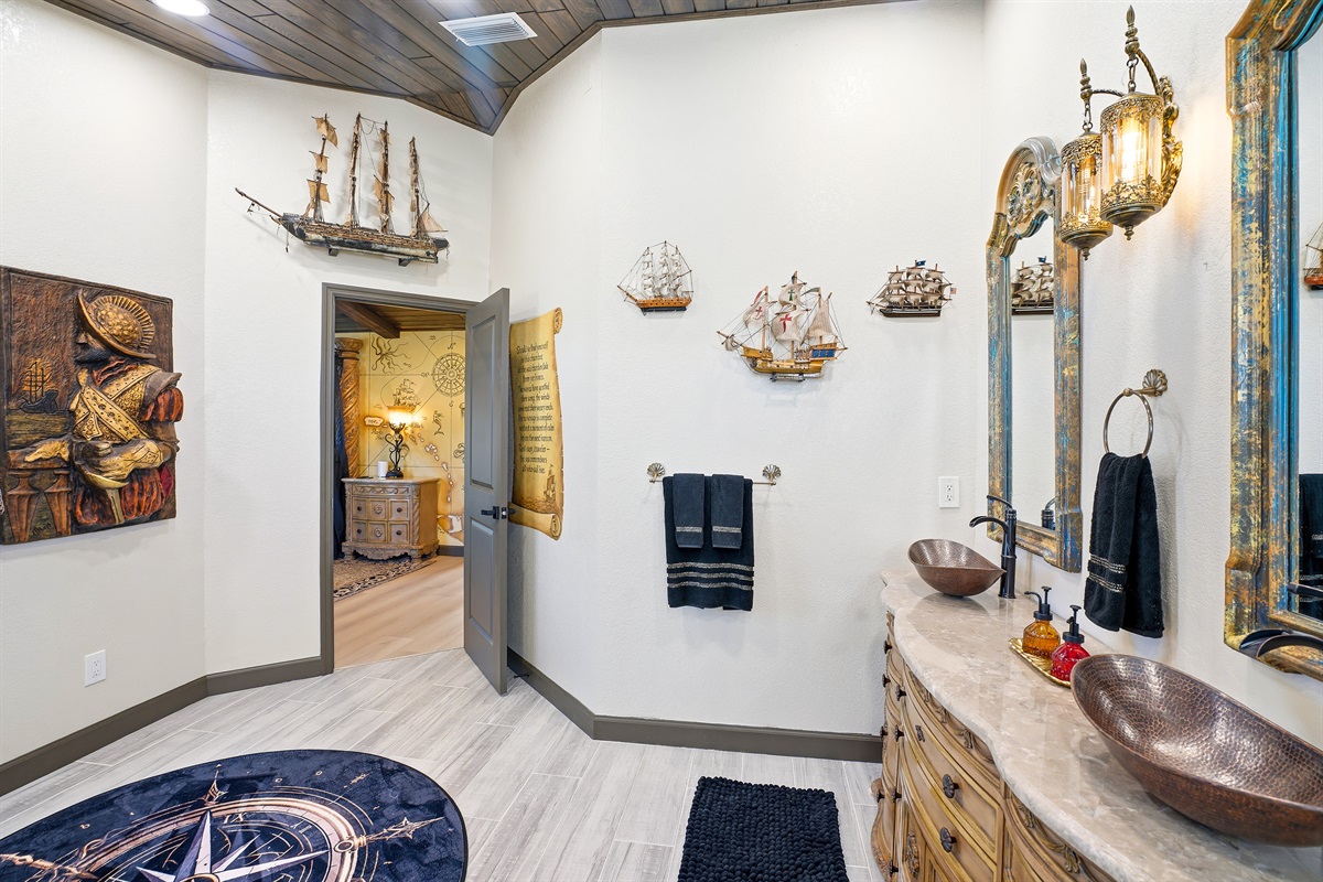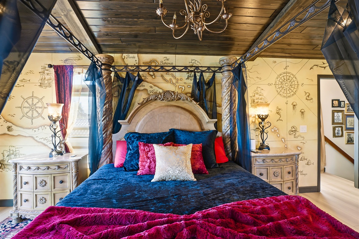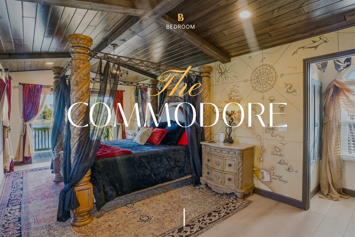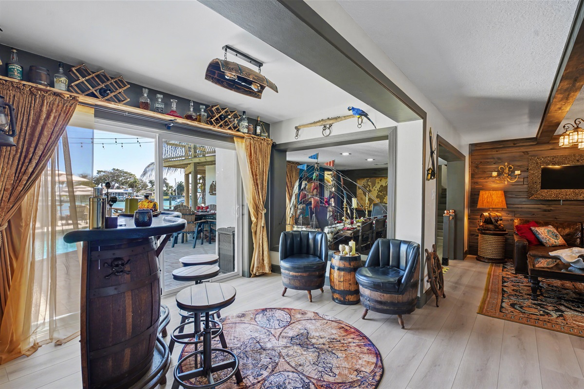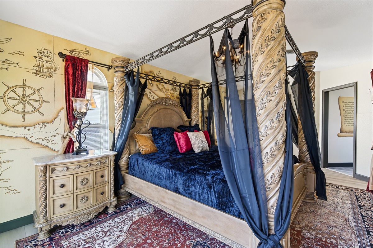 5 Bedrooms • 4 Bathrooms 4 Baths • Sleeps 7-10Welcome to The Gilded Compass, a pirate’s paradise where coastal luxury meets legendary adventure. This mythic 5-bedroom, 4-bathroom waterfront estate is your crew’s dream destination, blending swashbuckling charm with modern elegance. The entire property is adorned with a unique pirate theme, featuring custom art and vintage maps that will transport you to a world of high-seas adventure.