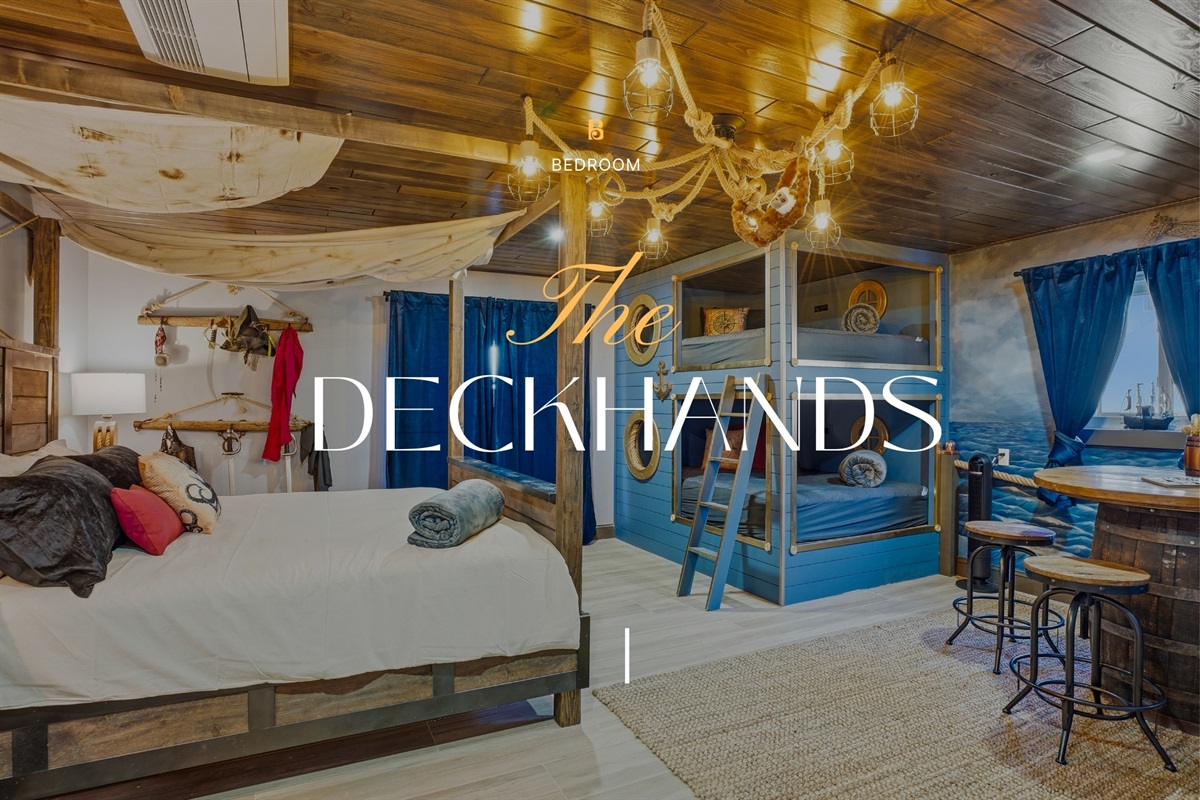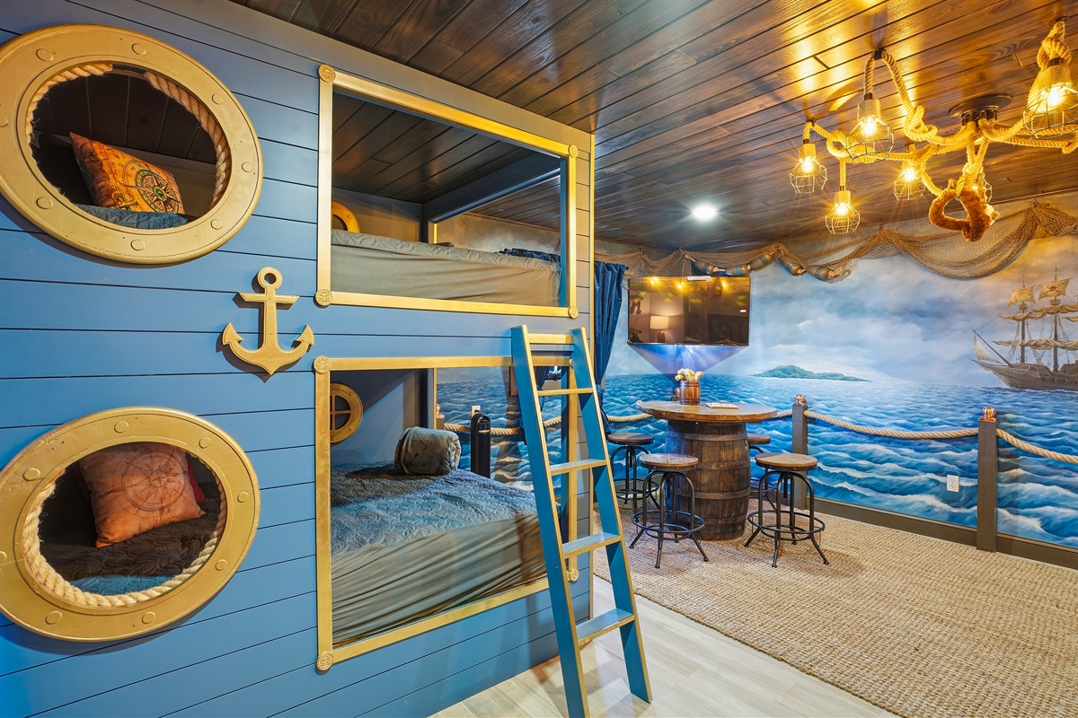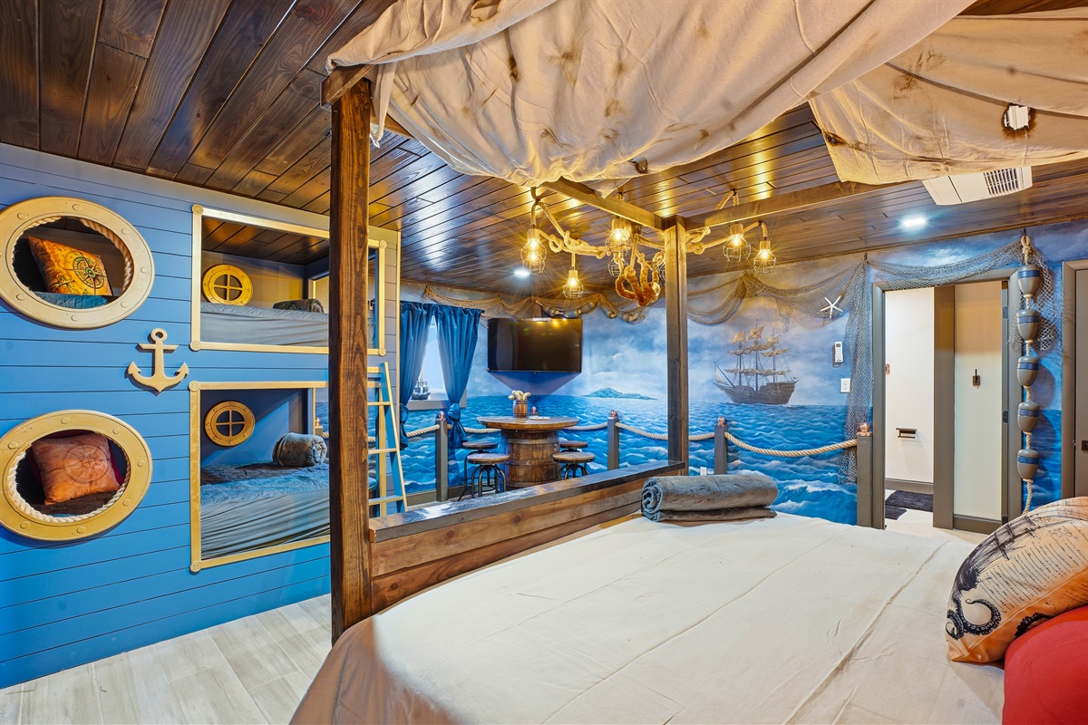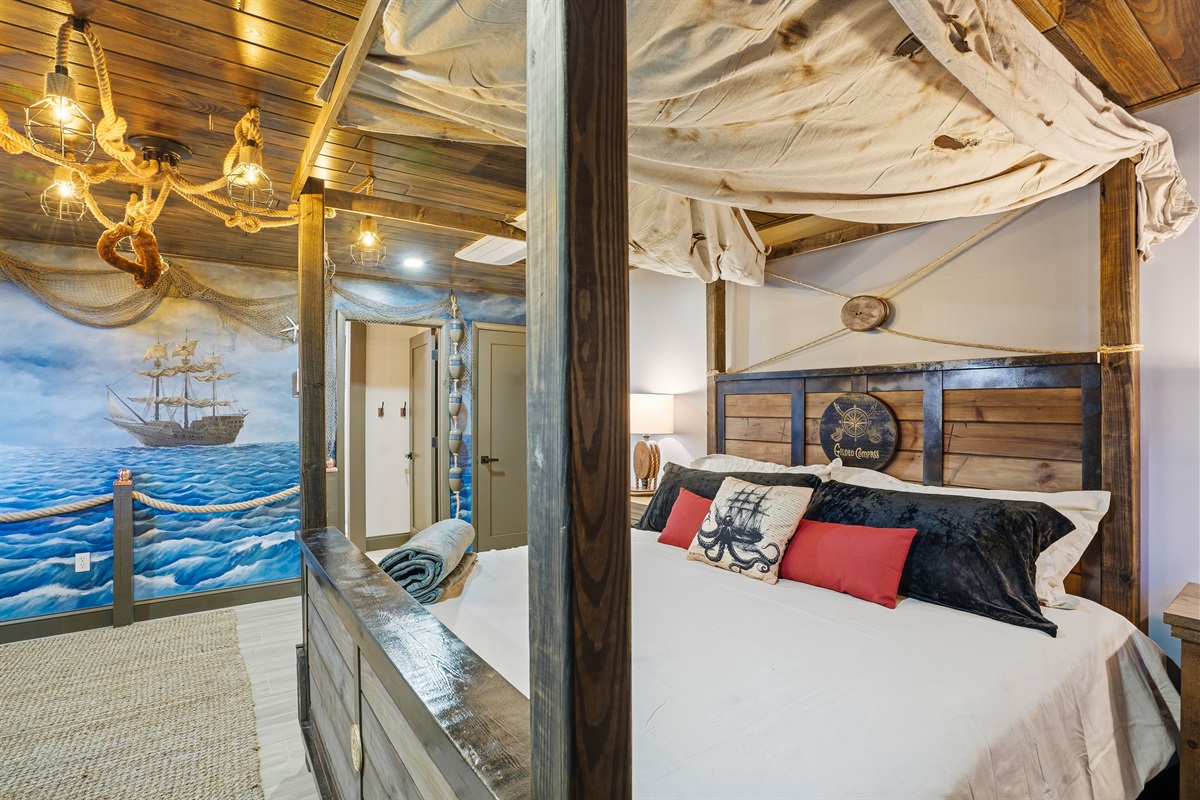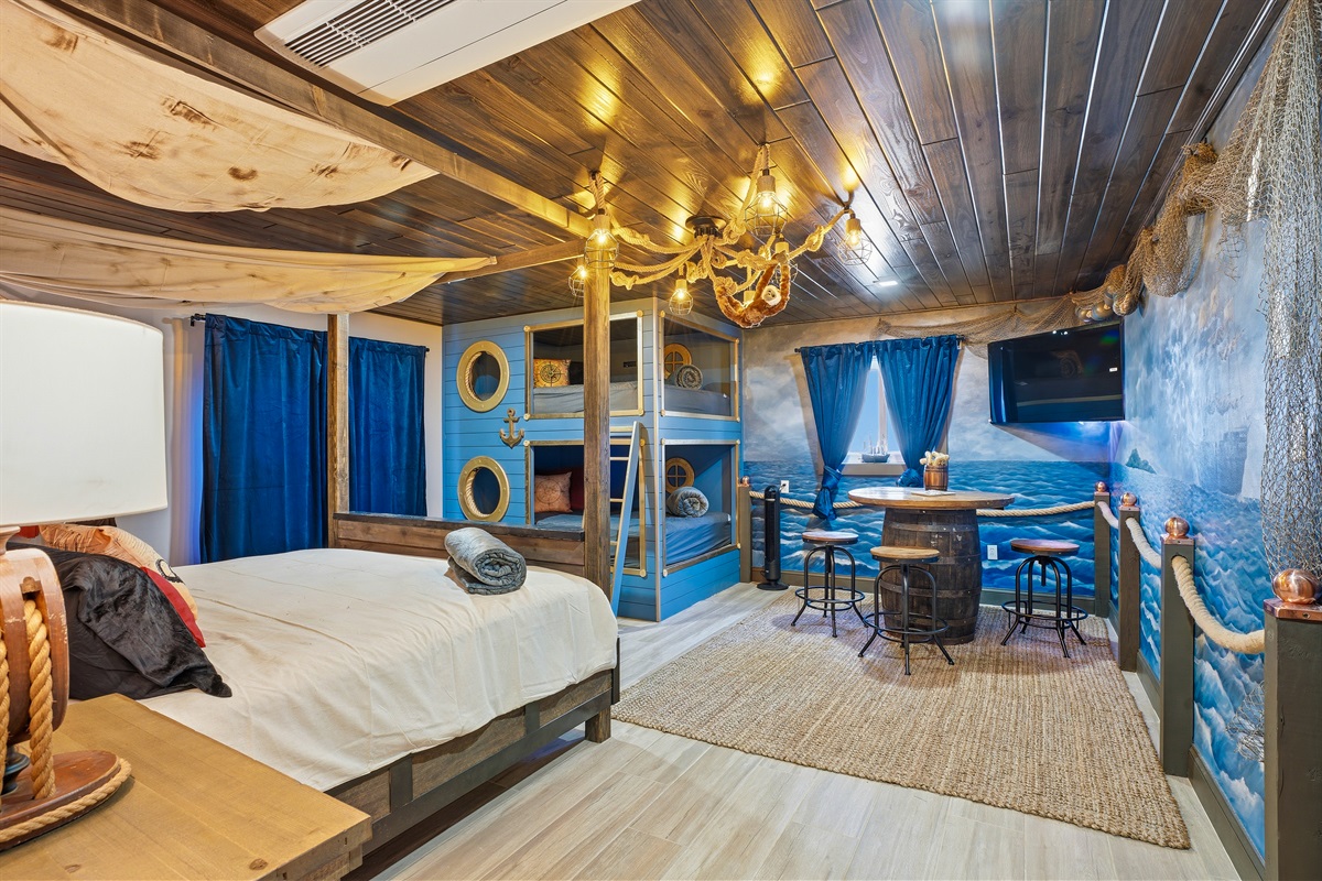 Each of the 5 spacious bedrooms is a private retreat, featuring a comfortable king bed, a smart TV, and its own unique pirate-inspired décor. With 4 full bathrooms complete with upscale fixtures and nautical touches, the home comfortably sleeps up to 10 guests, making it ideal for family flotillas or groups of friends.