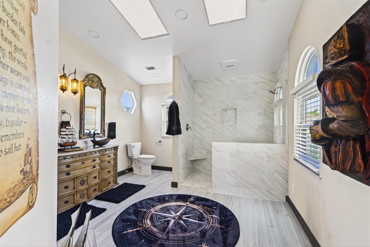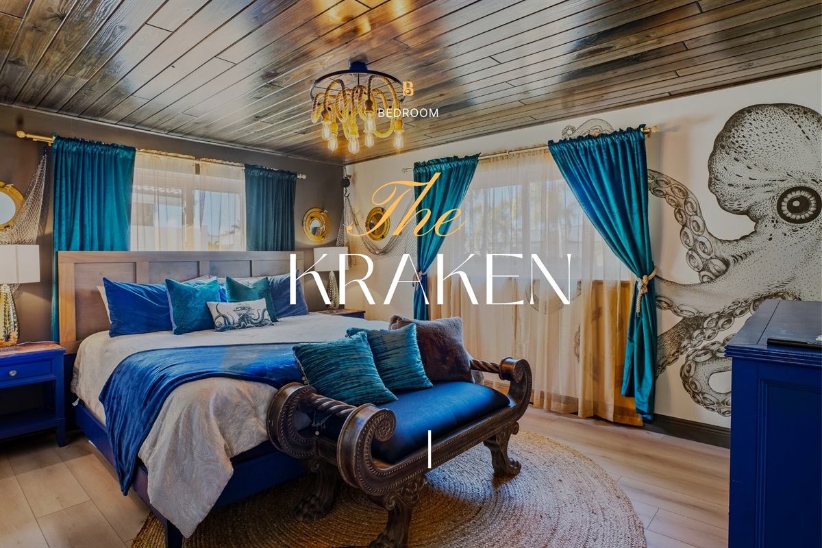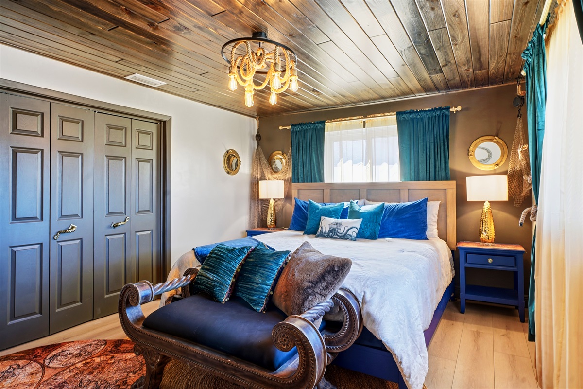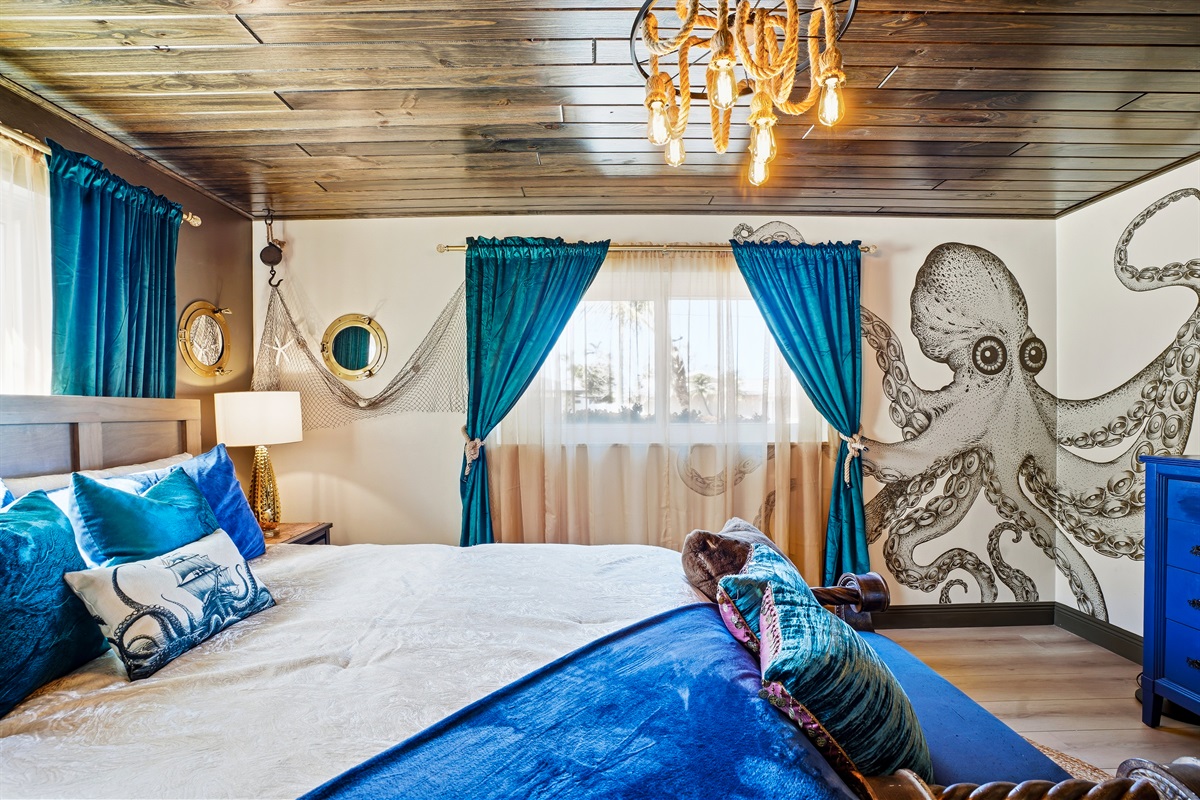 Each of the 5 spacious bedrooms is a private retreat, featuring a comfortable king bed, a smart TV, and its own unique pirate-inspired décor. With 4 full bathrooms complete with upscale fixtures and nautical touches, the home comfortably sleeps up to 10 guests, making it ideal for family flotillas or groups of friends.