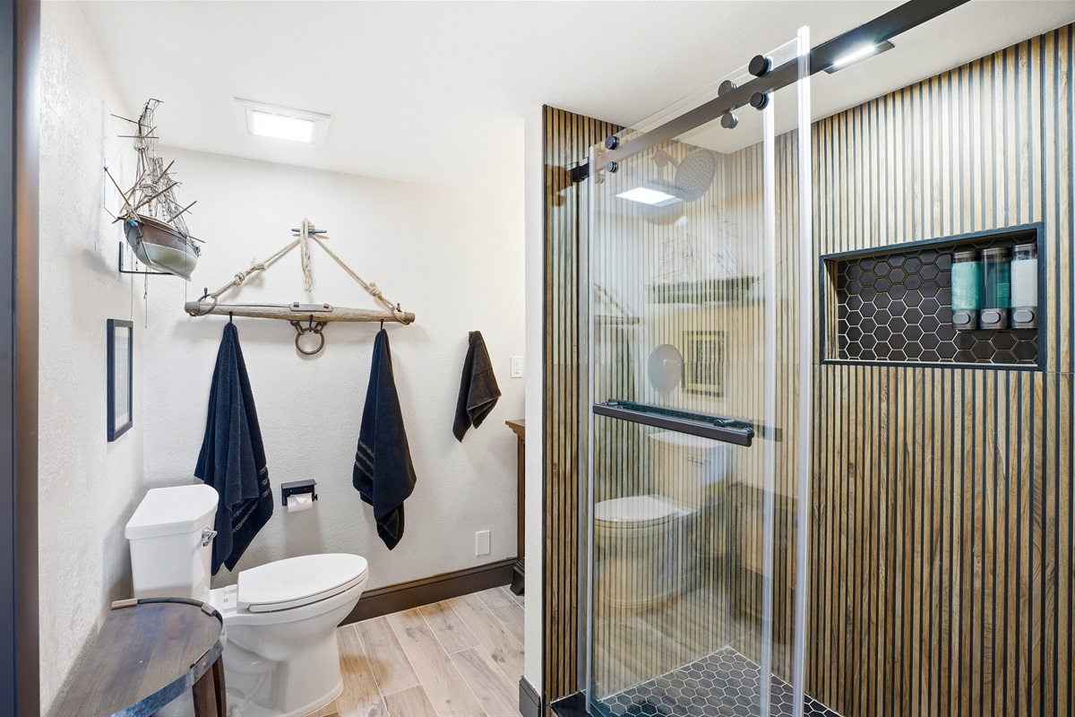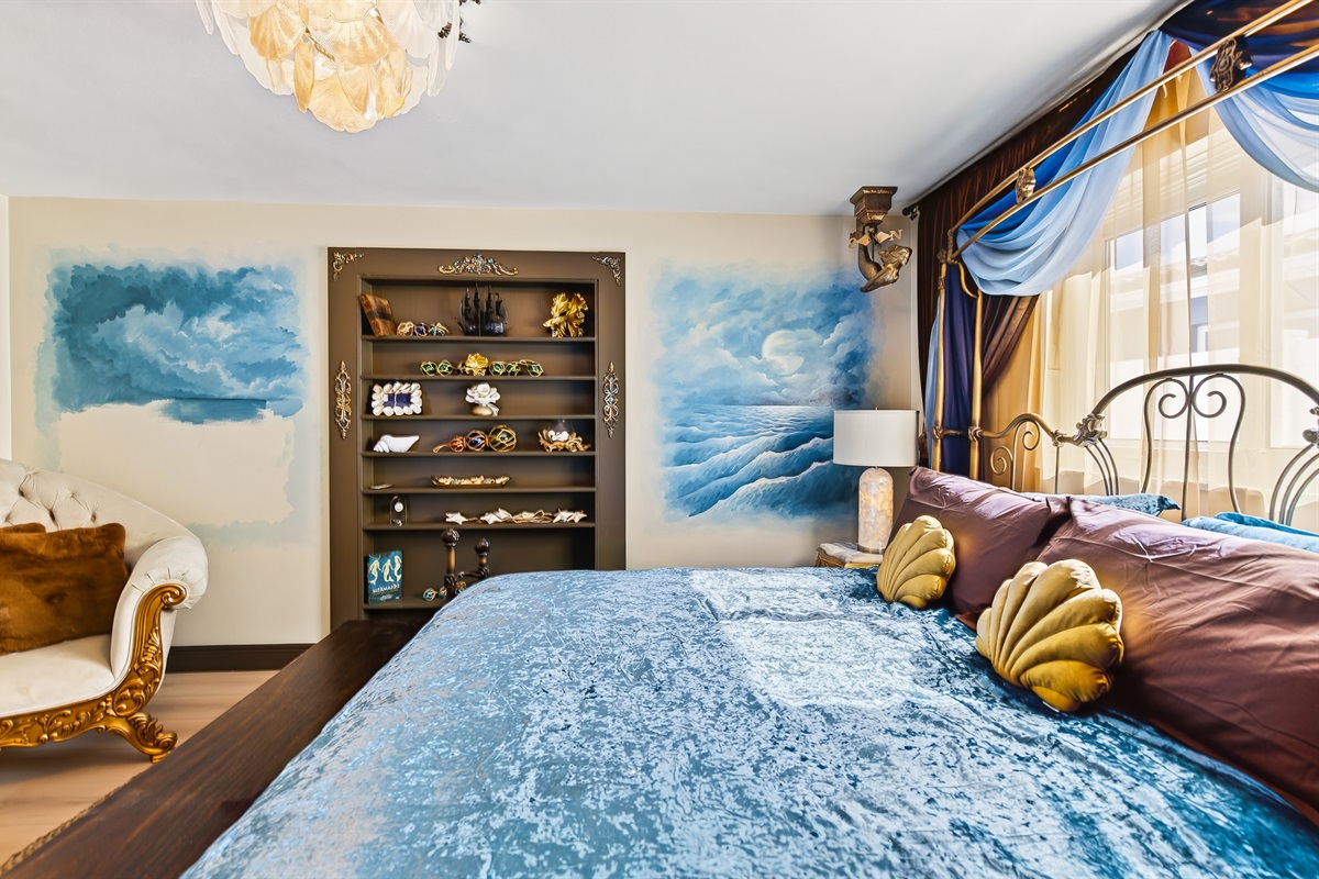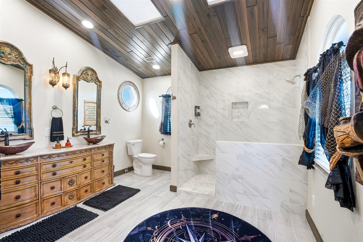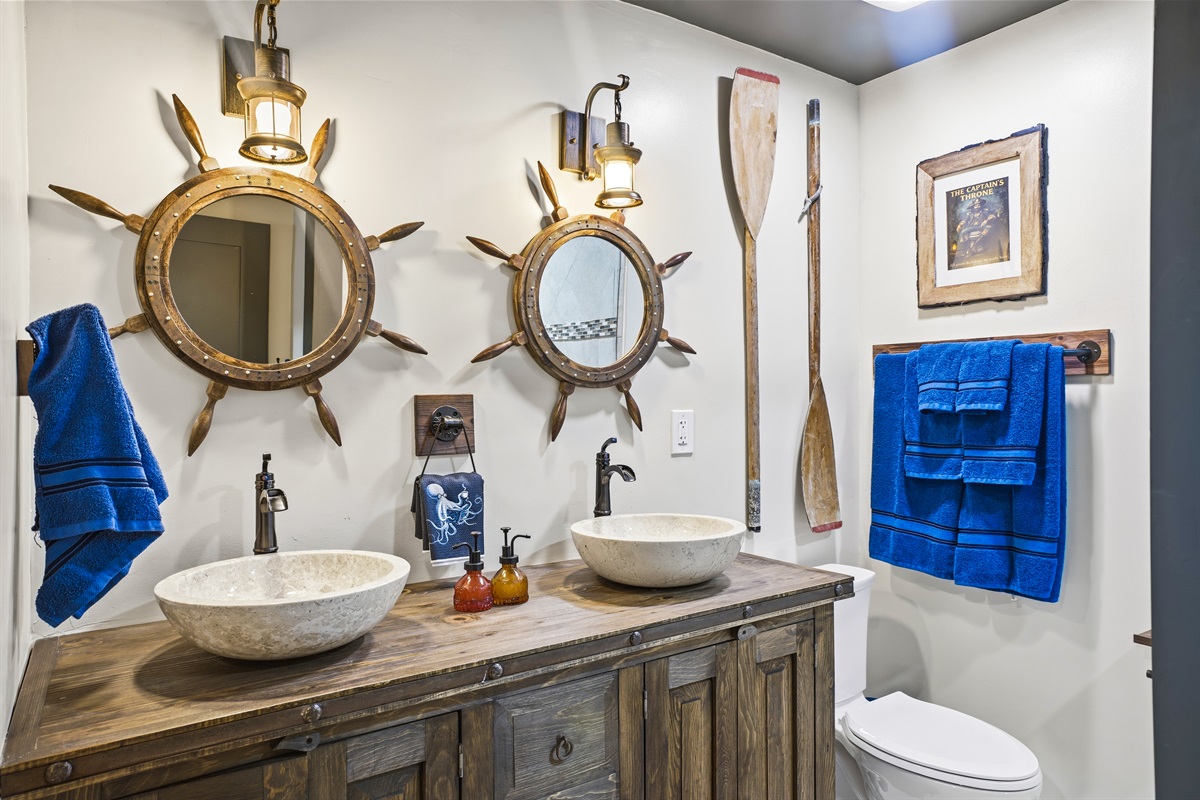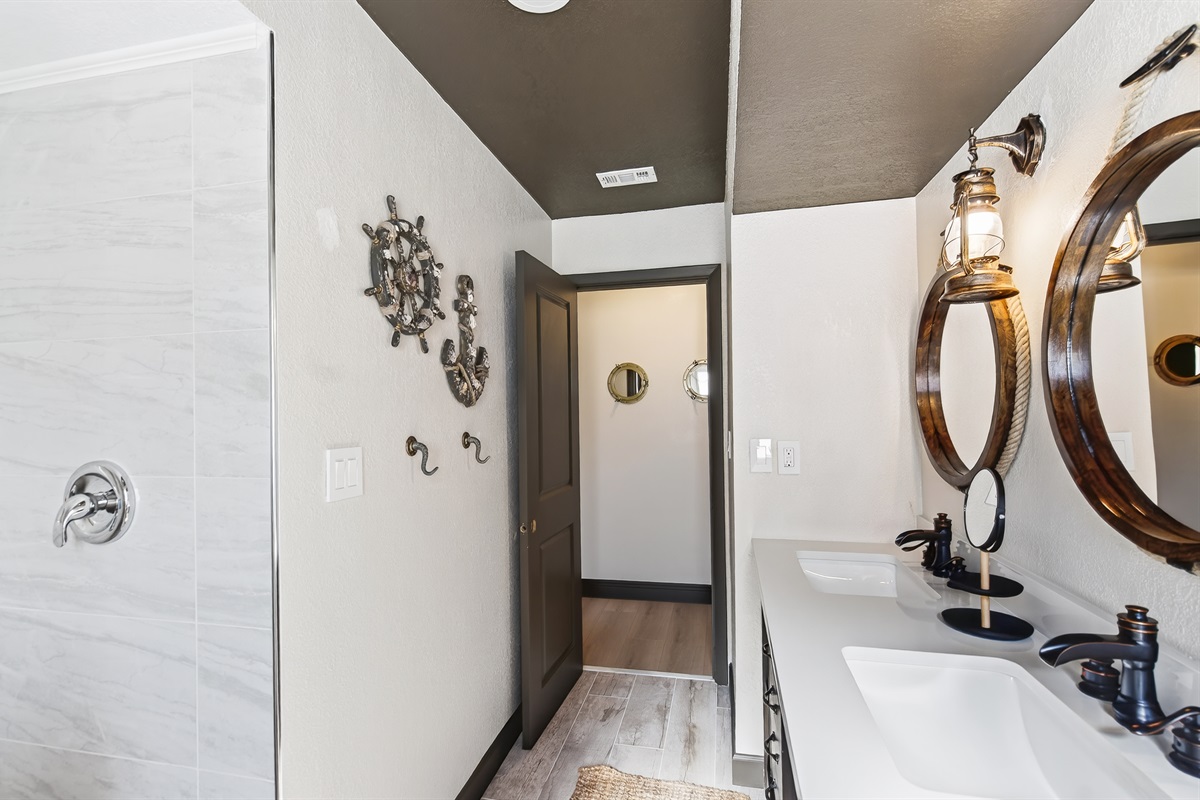 Each of the 5 spacious bedrooms is a private retreat, featuring a comfortable king bed, a smart TV, and its own unique pirate-inspired décor. With 4 full bathrooms complete with upscale fixtures and nautical touches, the home comfortably sleeps up to 10 guests, making it ideal for family flotillas or groups of friends.