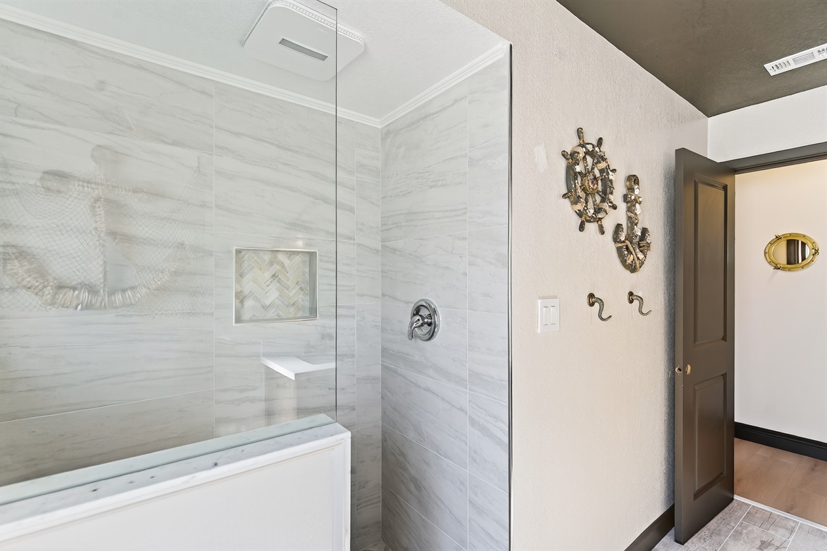 Inside, each of the five bedrooms is a private haven, outfitted with plush king beds and smart TVs. Two master suites open directly to the sea, with sliding glass doors that let the ocean breeze drift in like a whispered legend. The bunk room, with queen-over-queen beds, is perfect for young buccaneers or extra mates.