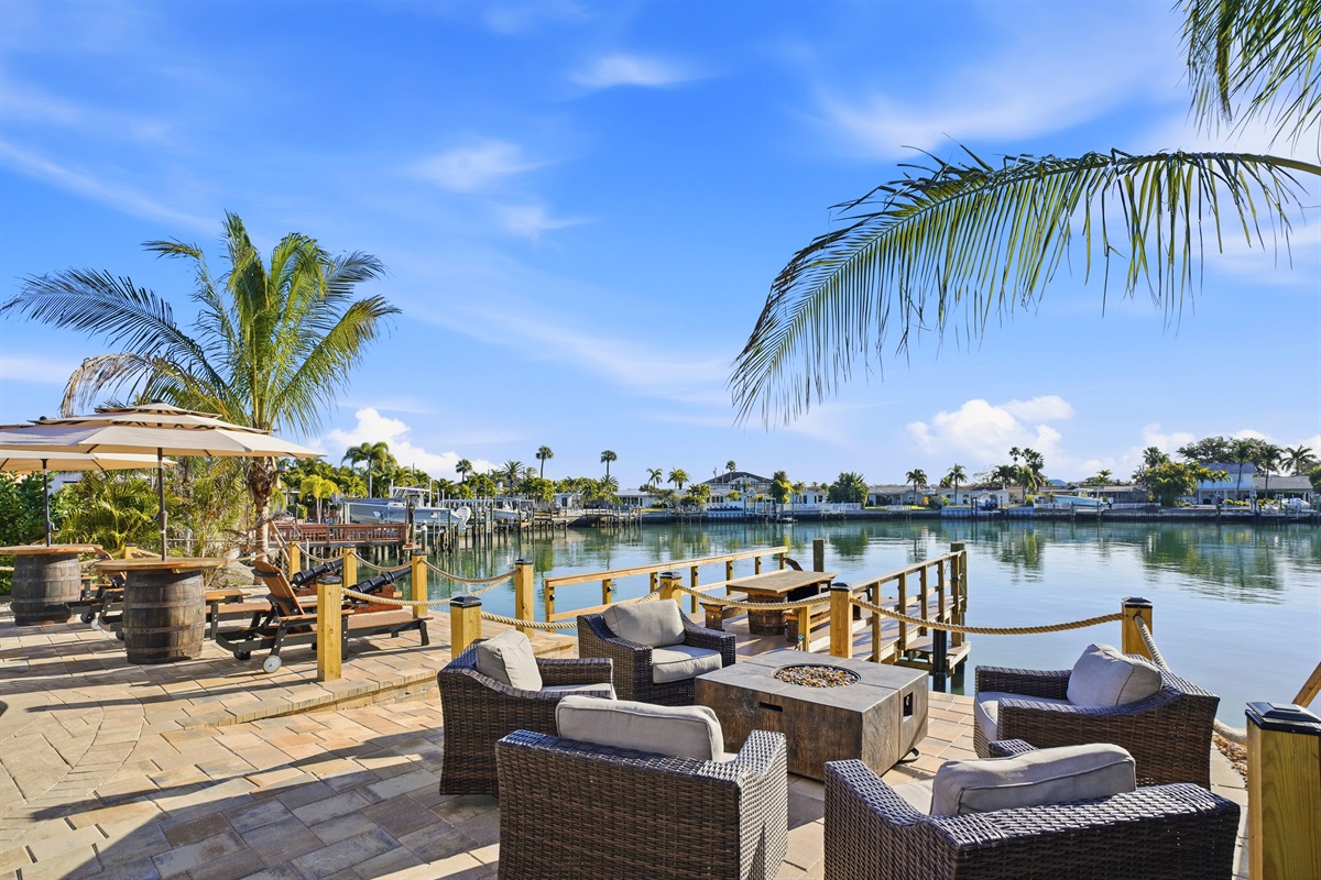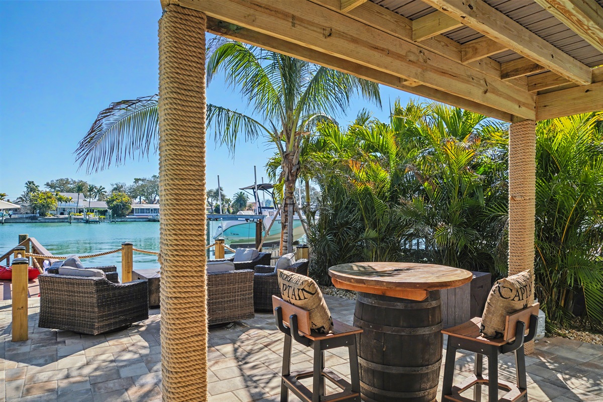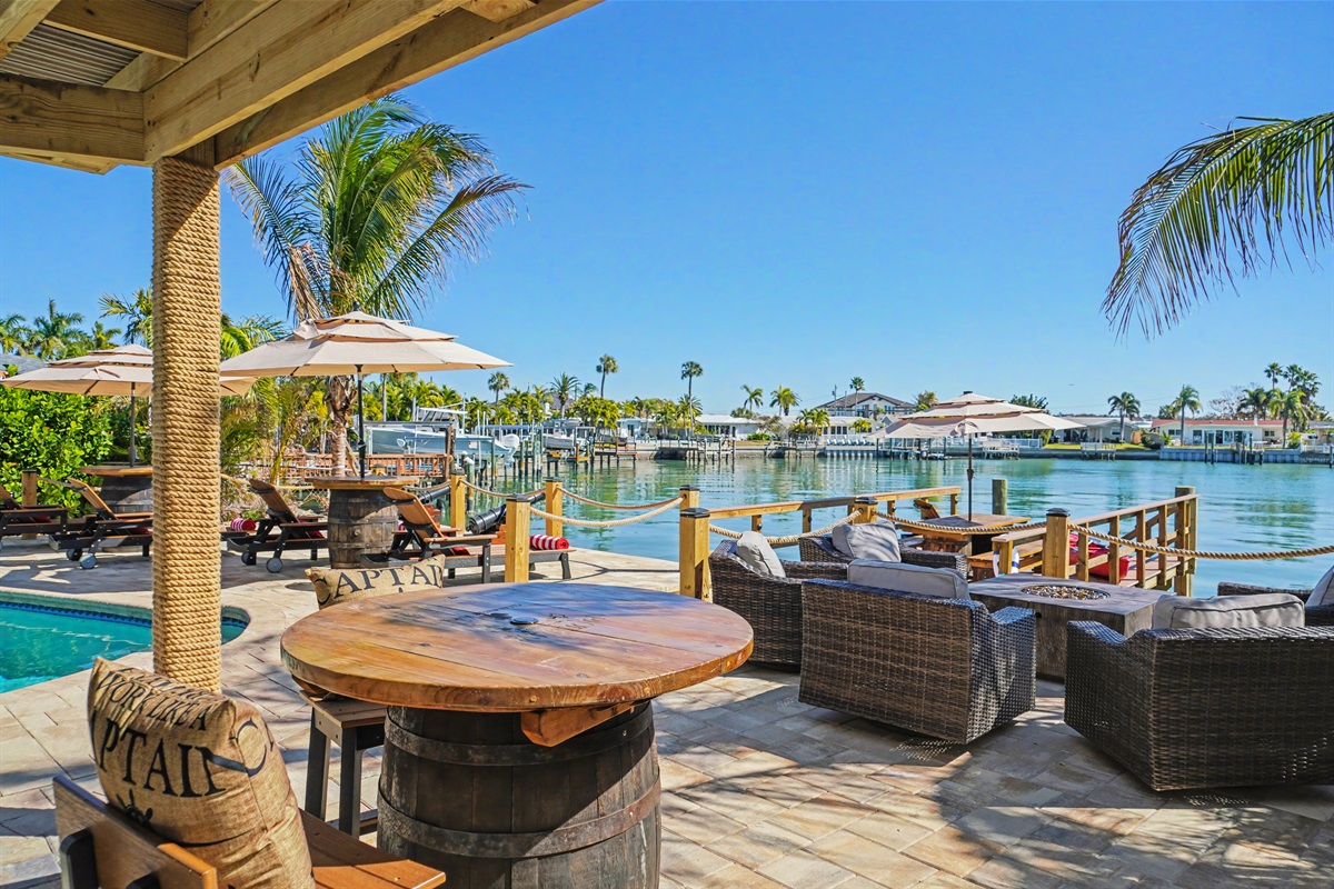 Al Fresco Dining: An outdoor dining area with a bar, griddle and comfortable seating overlooks the water, providing the perfect backdrop for any meal.